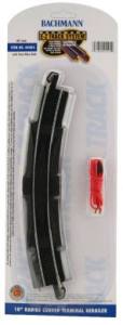 The terminal rerailer is connected via terminal wires to a power pack, which provides current to power the layout. In addition to making power connections, the terminal rerailer is also designed to correct derailments that sometimes occur during normal railroad operations. Rerailers are installed after difficult sections of track (turnouts, crossings, “S” curves, etc.) where derailments may occur. Also available in the E-Z Track® system is an 18” Radius Curved Rerailer (Steel Alloy; 2 per card; Item No. 44429) if you need a rerailer but do not need to make power connections.
