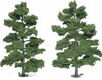 Two deciduous trees (Medium Green) that range in size from 8″ to 9″. Real world size: HO scale 58′-65′ – O scale 32′-36′.