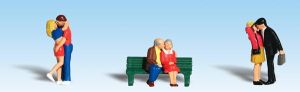 elderly couple sits on a bench and the man steals a kiss from the woman.