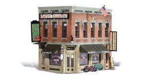 An old-time three-in-one store. Barber shop in front, tobacco shop in rear with billiards upstairs. There are three cycles and an old Cigar Store Indian outside the door. There are signs, posters, a flag, awnings and an old barber pole.